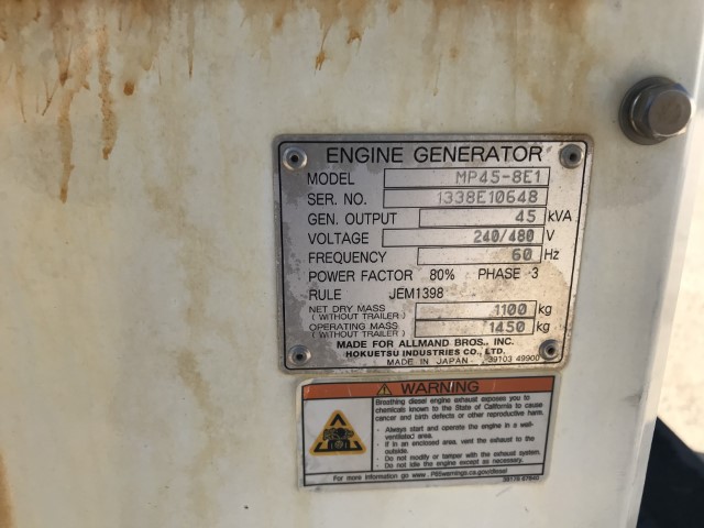 Isuzu BP-4LE2X Engine with Electric Starter. This Allmand MP45 (39 kW Generator) is for sale and backed by our 30 day warranty. Contact our industrial generator experts with your questions.