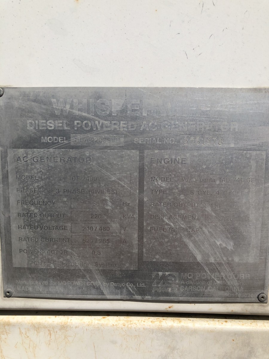 Volvo Penta TAE 741 GE Engine with Electric Starter. This Multiquip DCA-220SSVU (200 kW Generator) is for sale and backed by our 30 day warranty. Contact our industrial generator experts with your questions.