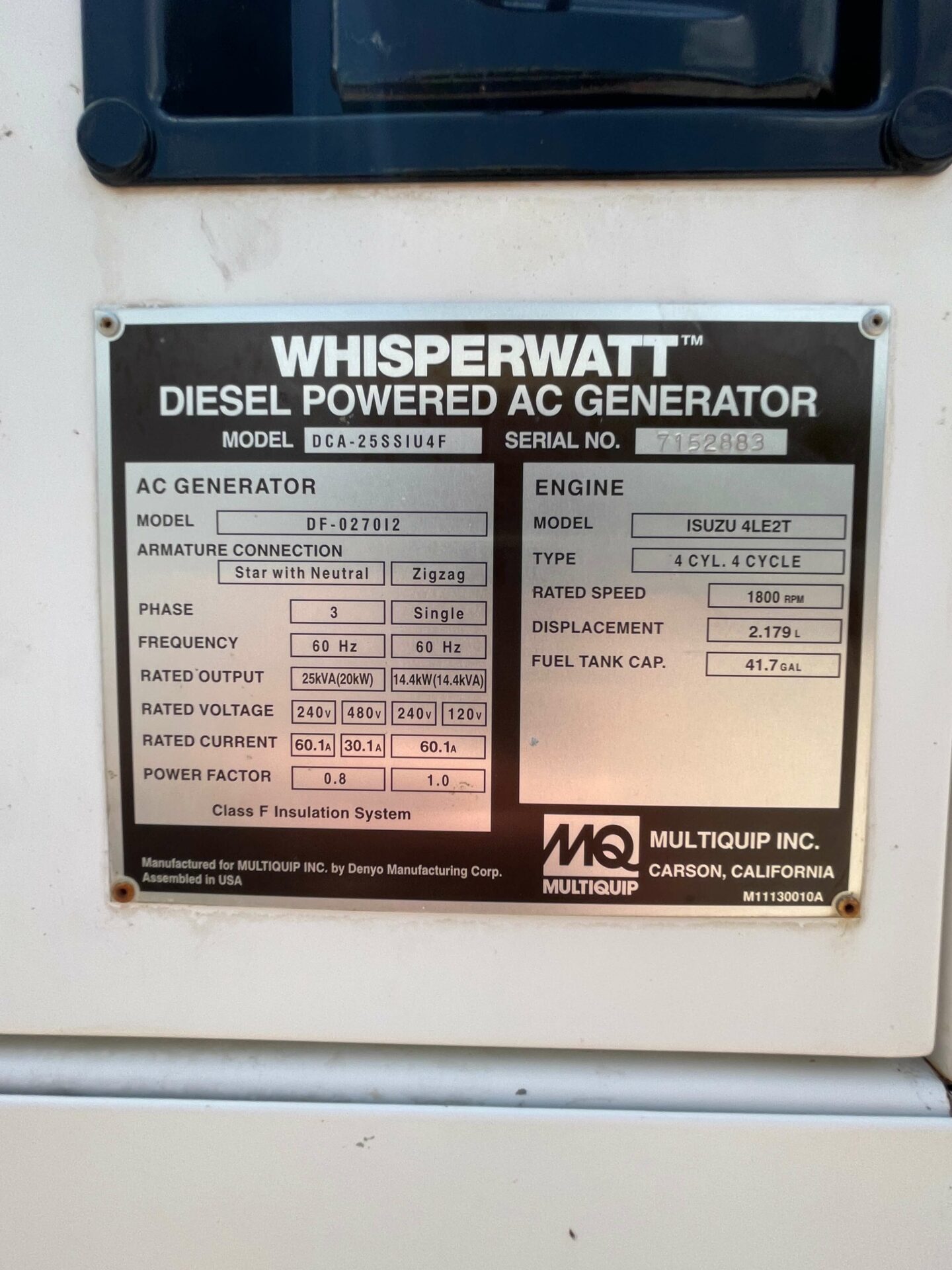 Isuzu BZ-4LE2T Engine with Electric Starter. This Multiquip DCA25SSIU4F (22 kW Generator) is for sale and backed by our 30 day warranty. Contact our industrial generator experts with your questions.