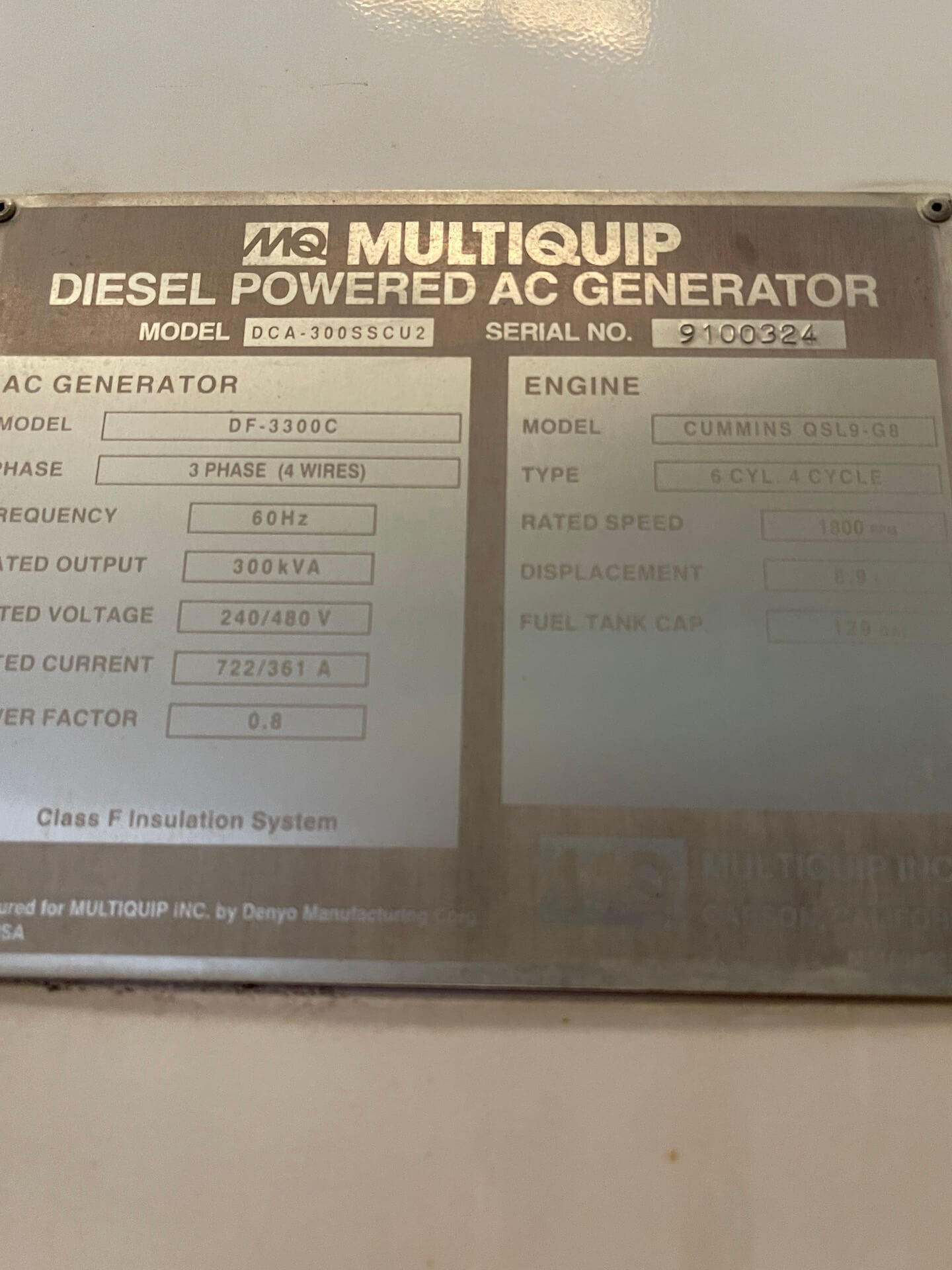 Cummins QSL9-G8 Engine with Electric Starter. This Multiquip DCA300SSCU2 (240 kW Generator) is for sale and backed by our 30 day warranty. Contact our industrial generator experts with your questions.