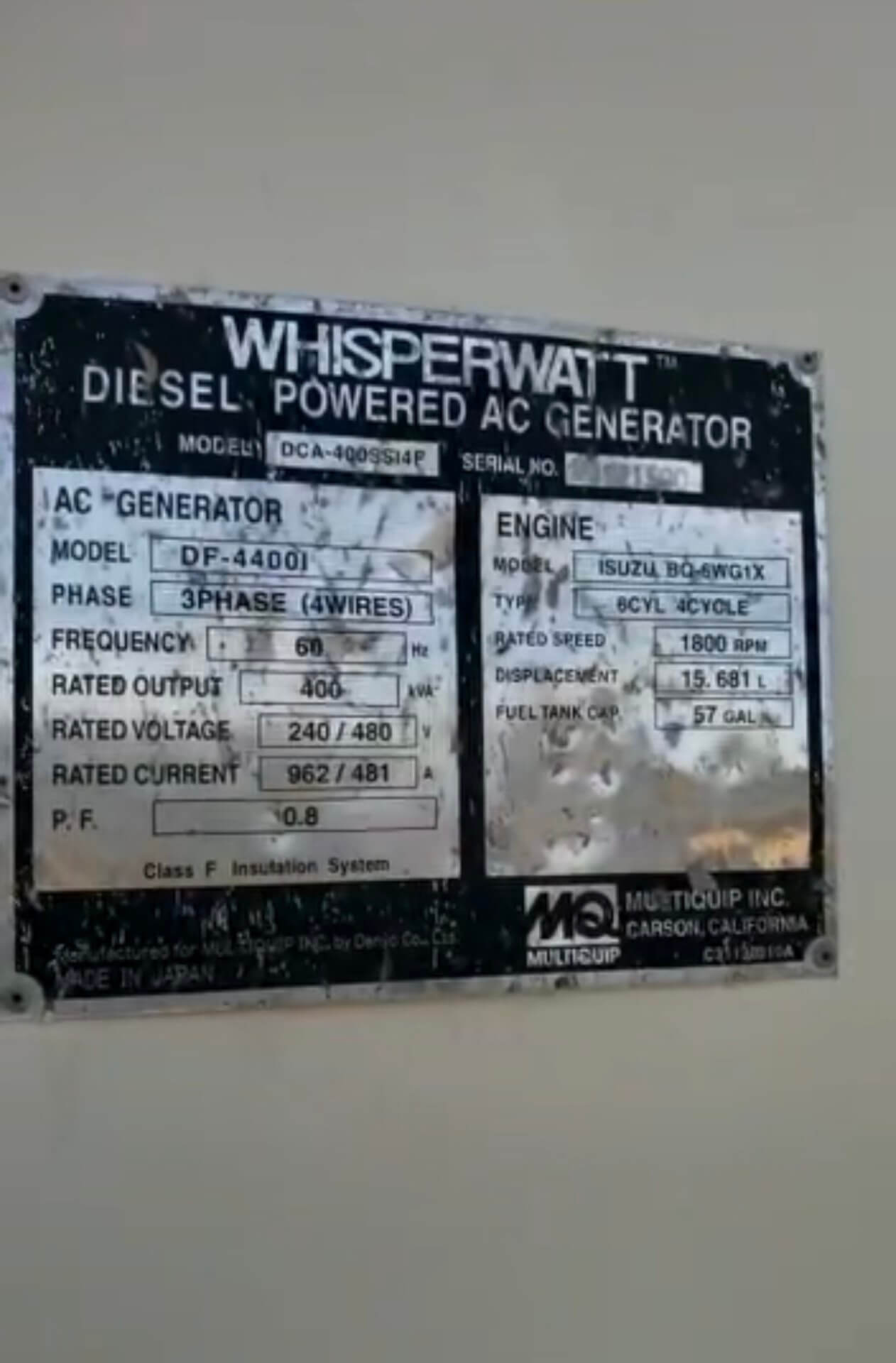 Isuzu BG-6WG1X Engine with Electric Starter. This Multiquip DCA400SSI4F (336 kW Generator) is for sale and backed by our 30 day warranty. Contact our industrial generator experts with your questions.