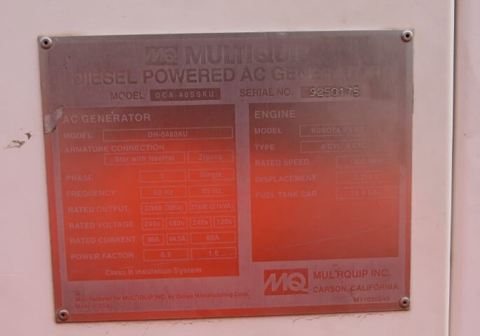 Kubota V3300 Engine with Electric Starter. This Multiquip DCA40SSKU4 (31 kW Generator) is for sale and backed by our 30 day warranty. Contact our industrial generator experts with your questions.