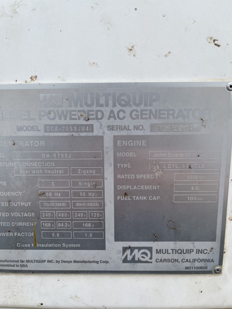 John Deere 4045HFG92 Engine with Starter. This Multiquip DCA-70SSJU4i (56 kW Generator) is for sale and backed by our 30 day warranty. Contact our industrial generator experts with your questions.