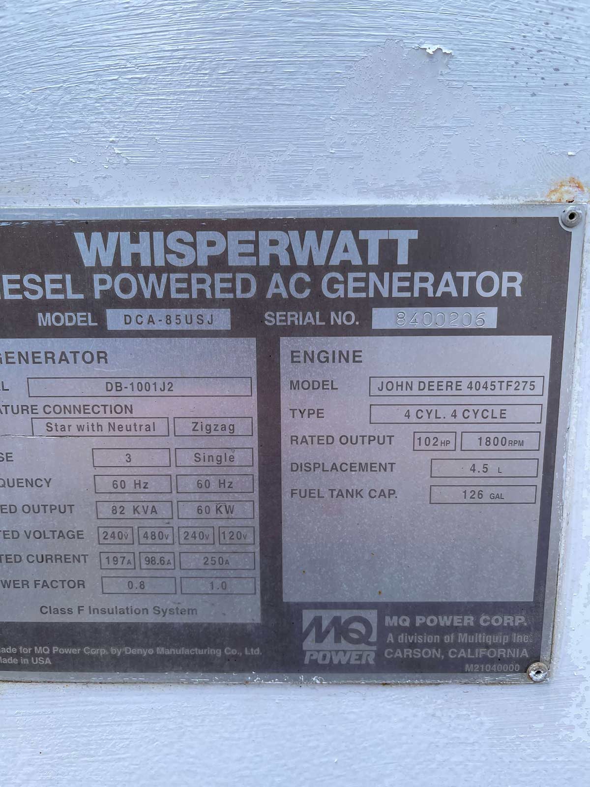John Deere 4045TF275 Engine with Starter. This Multiquip DCA-85USJ (75 kW Generator) is for sale and backed by our 30 day warranty. Contact our industrial generator experts with your questions.
